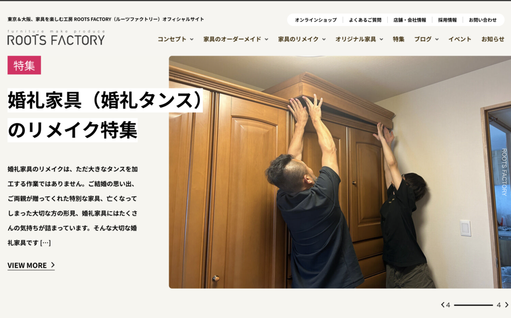 「婚礼家具のサイズダウン」を得意とする専門店です。背が高すぎて圧迫感のあるタンスを、デザインの雰囲気をそのままに残しつつ、現代のマンション等にも置きやすい高さや奥行きにカット(リサイズ)してくれます。実用性を重視したい方におすすめです。