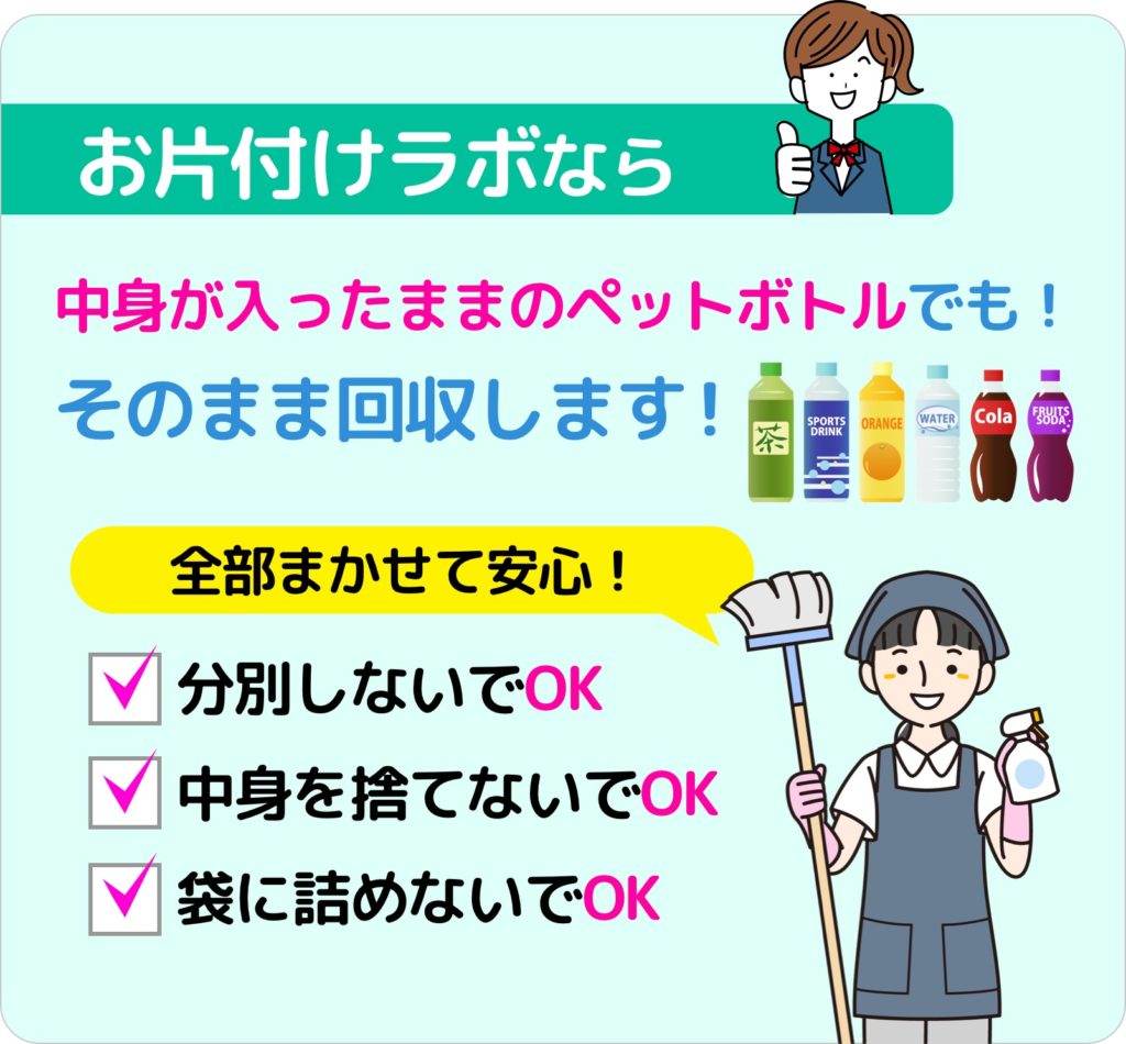 ペットボトルを放置する危険性を下げるためにも、低価格で依頼しやすいお片付けラボにぜひご相談ください。